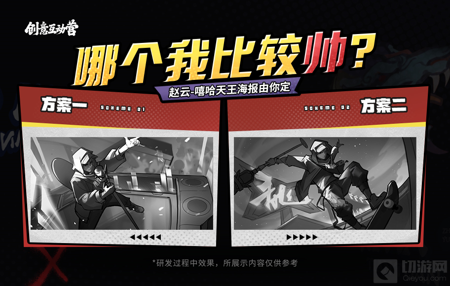 2、活动内容:玩家可从两版赵云-嘻哈天王的海报线稿方案中,选择心仪的方案投票,助力其成为最终游戏内海报。