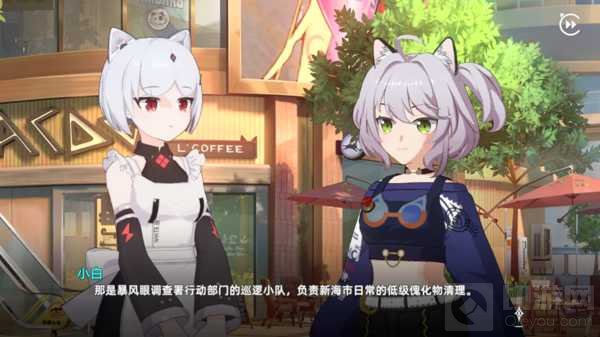 办公地点与后勤:玩家的办公地点位于一个咖啡屋内,看来设计师很懂嘛,猫娘女仆咖啡绝配。而这里的办事员小白可在小白猫与拟人形态之间进行切换,会给予玩家初期装备,以及各种情报支持,顺便一说,小白的吐槽功夫一流。