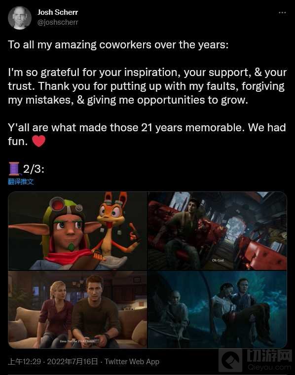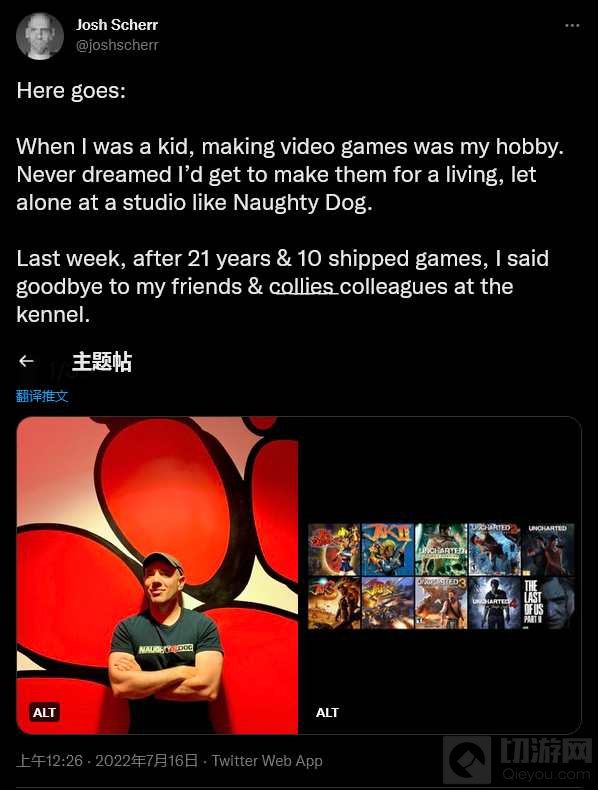 顽皮狗的传奇编剧 Josh Scherr,在工作室工作了 21 年后于7 月16日早些时候宣布了自己已经离职。在他在职期间,他曾参与过《神秘海域4》、《最后的生还者2》等作品的开发。总的来说,这位老将总共贡献了 10游戏,包括《杰克的达斯特:旧世界的遗产》以及《神秘海域3》等。 Scherr 最初是一名动画动画师,后来担任编剧和叙事设计师。