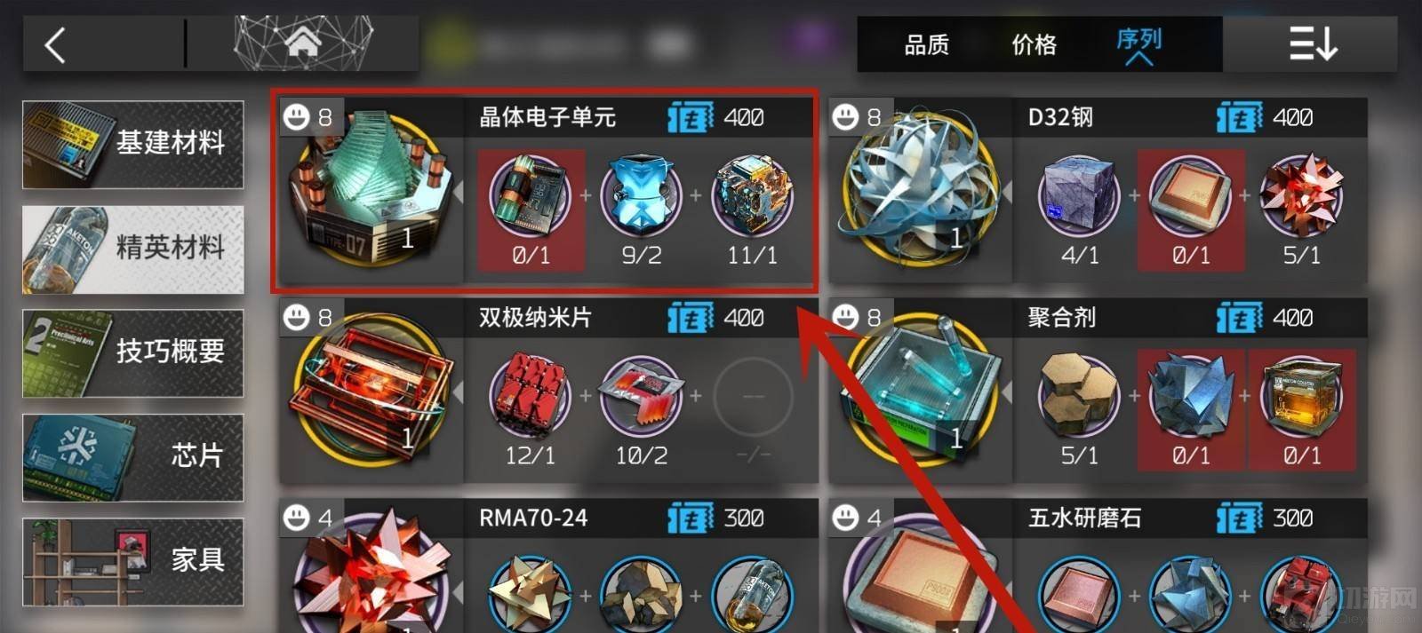 3.在加工站界面内找到精英材料,在精英材料页面中,可以看到晶体电子单元。