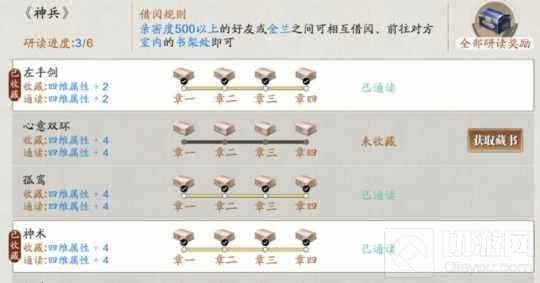 神兵的等级到8级、12级都会有额外的功力加成,8级可以激活伙伴增加48-64点功力。12级可以获得藏书,连收藏带研读则可以获得51-64点功力。书籍可以去排行榜前10的大佬家里提前进行研读。