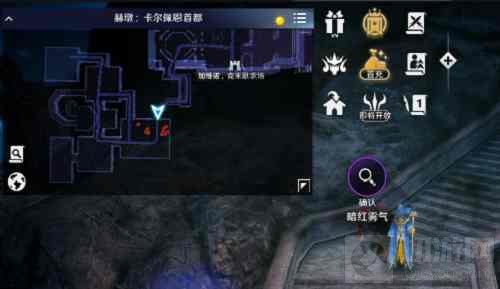 3、在“目击之谈”任务中,顺着卡尔佩恩议会的台阶往下走,可在如下图所示位置调查暗红雾气。