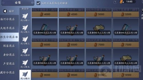 4、胜负令及战心铸:120级可以兑换6级上衣和主武器战心铸,需要8500+9000=17500点胜负令。下周4品/5品自选战心铸可以留着等升级后再用,武器和上衣都是战心铸加的比较多的部位。