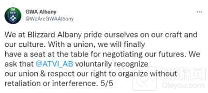 这些员工以“阿尔巴尼游戏工人联盟”的名义组织起来,并在推特上宣布了他们的工会声明,并讨论了他们希望倡导的问题,其中包括薪酬公平、薪酬透明和工作与生活的平衡。并且,声明最后敦促动视暴雪“自愿承认我们的工会,尊重我们的组织权利,不受报复或干扰。”