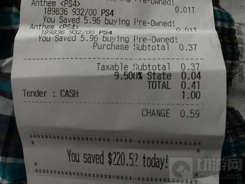另一个消息来源则是玩家论坛,一个名为Spider-Man_Fan的Reddit用户晒出了一排《圣歌》游戏,声称这是他在Gamestop批发的——税后价41美分,该用户还晒出了他的小票,显示他支付了1美元、找零59美分。