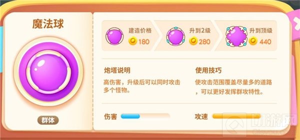 炮塔说明:用泡泡将敌人包裹并减速。建造价格:120金币,升到2级200金币,升到顶级280金币。