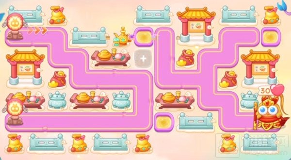 通关思路:那么这一关呢障碍的布置也是慢慢当当的,玩家能够使用的炮塔有烟花,魔法球,毒针还有船锚,开头可以先用船锚或者魔法球放在中间清理障碍,兔子出口放毒针减速增伤,后期大量使用魔法球和烟花提升输出能力。