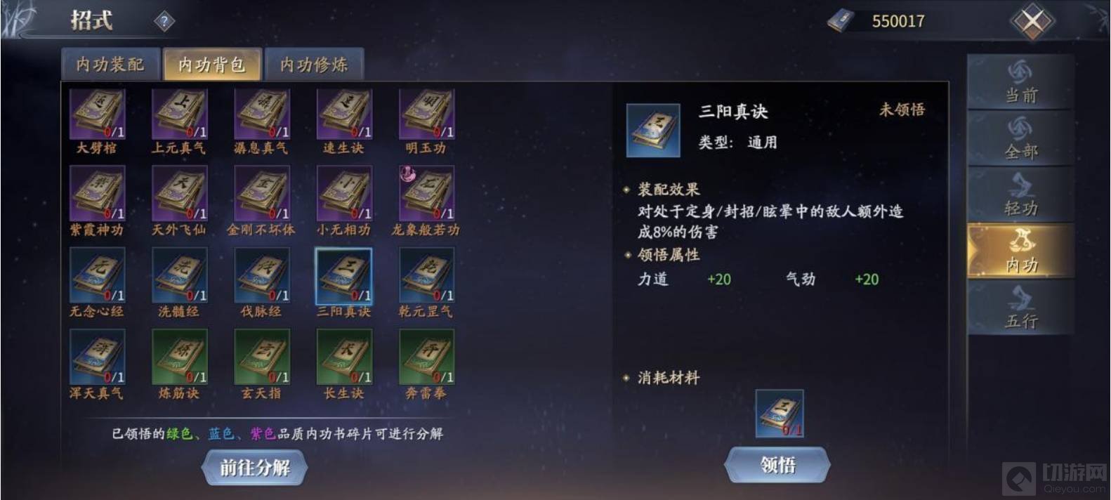 九、内功选择:《破虏令》、《嫁衣神决》、《寒冰真气》、《龙象般若功》都是琴的专属内功,红橙等高等级内功较难获得,这里主要说一下紫色《龙象般若功》,它可以增加琴的招式伤害5%,提升所有技能的输出上限,搭配上《乾元罡气》《伐脉经》等蓝色内功,还可提升辅助能力,控制、回血能力提升,琴职业玩家本身的站场能力也有保障。如果想要选择输出的话,推荐《三阳真诀》,对定身/封招/眩晕敌人会额外造成伤害,适合琴这种控制频繁的武器。