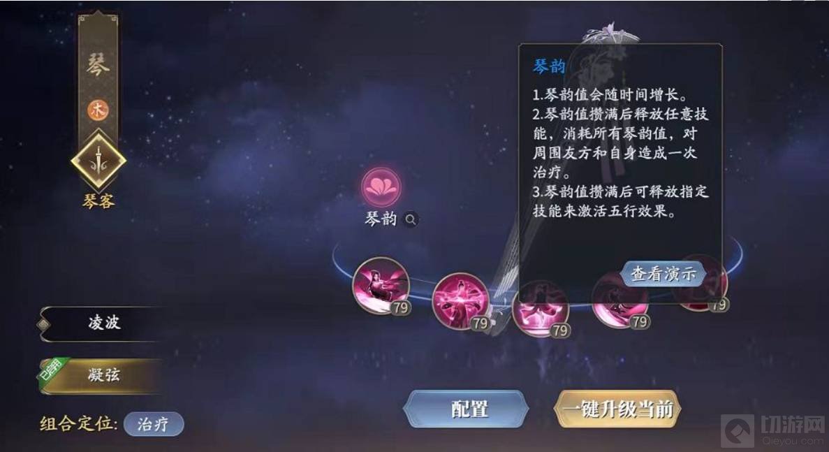 四、技能解析:被动“琴韵”:随着时间的积累琴韵值可以不断累加,直到积攒满后便可施放任意技能触发,触发后周围内的友方和自身都会得到一次治疗。“琴韵”的存在,也让琴的两大招式体系“凌波”、“凝弦”,有了更明确的定位。偏向输出的“凌波”,在有了回复手段后,可增强放风筝能力,PVP作战连招更灵活;而主核心就是回复的“凝弦”则进一步加强了作为奶妈的治疗强度,保证了队友的后续爆发以及持续作战。