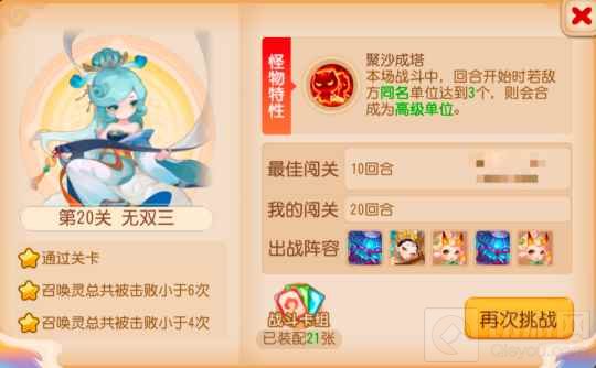 通关指南:针对怪物召唤合成的特性,群法输出并不是一个很好的选择,因为我们可以考虑点杀为主,优先集火能够召唤的主怪-明知使,对其进行集火点杀。如果物理召唤灵多的玩家,可以在召唤灵配置上优先物理召唤灵(增强点杀能力),同时在卡牌的选择上也以物理增益为主。