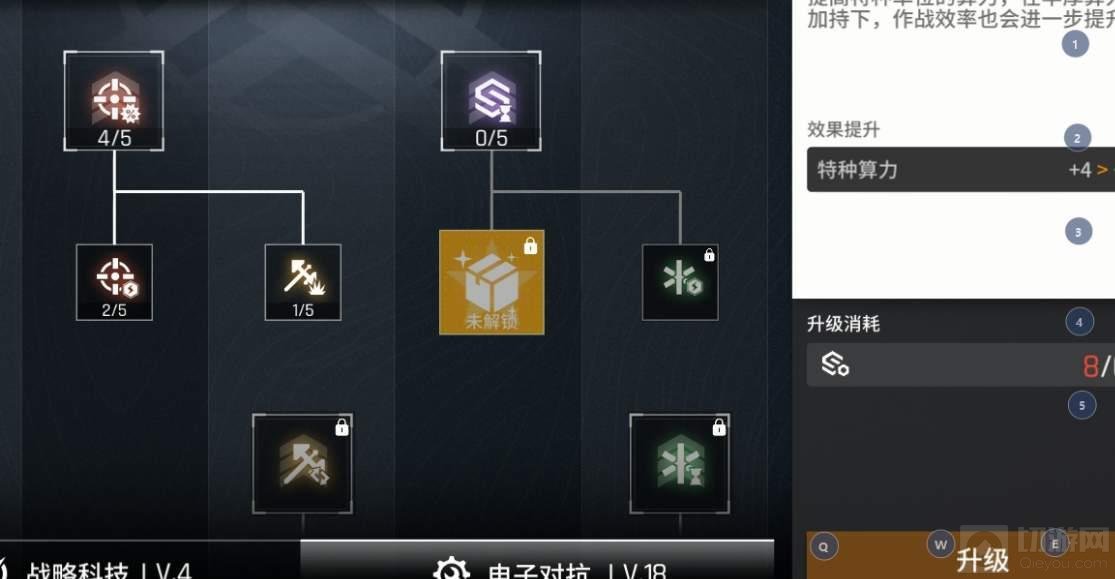 电子对抗是跟职业相关提升算力的系统,通关2-12后在战略科技界面,玩家可以通过下方的选项卡切换至电子对抗页面并对其进行升级。