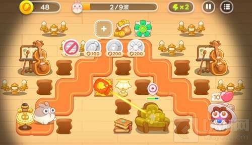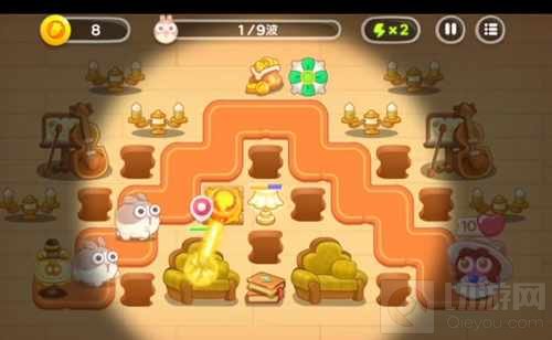 1、开局时候在左侧建立火瓶,升到两级,剩下的金币在上方地方建立一个风扇,左侧火瓶清理障碍,风扇帮助我们清理怪物兔子的同时还可以清理障碍,如果有打不到兔子用火瓶进行攻击,沙发障碍打掉之后,升级风扇,之后把全部灯打亮之后再打另一个沙发。