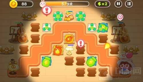 2、第二波就开始有滑板兔,这种兔子跑的非常快,出来之后集中全部火力打败,最上方左边放置两个风扇,火瓶子就清理建筑物,出口和萝卜附近建设普通瓶子。