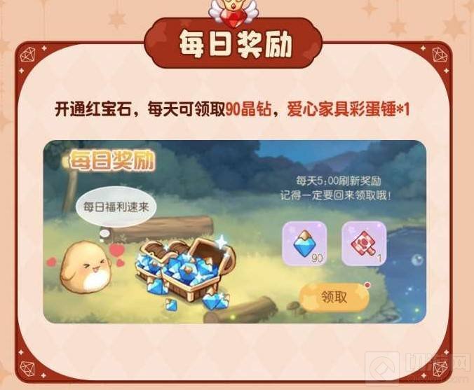 1、开通红宝石,每天可以领取奖励,90晶钻和暗信家具彩蛋锤一个。