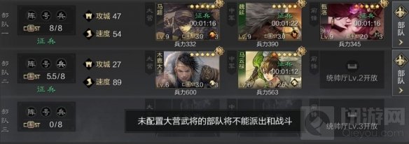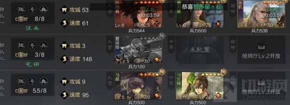 接下来是重中之重,也是开荒小白最需要改进的地方。屯田结束后,主力继续打3,期间如果主力在征兵,便可用二队打3,操作如图,将主力三个武将拆分到二三队进行征兵,补刀队放到一队,同时前锋挂上工具人,前期的3级地,最好打主城一环的,或者通过停留打3,降低战损,如果主力征兵还没好,补刀队打3又比较伤,可以将兵力最少的武将放到三队空位上征兵,征兵时间自行把握。如果主力刚打完一块4,此时补刀队还在征兵,可以将主力征兵时间拉到跟补刀队一样,征兵结束,换位置主力继续征兵,补刀队去第一队打3。