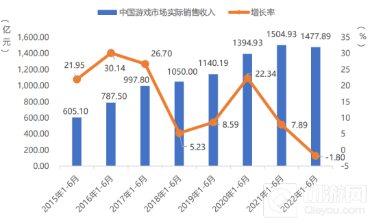 受市场大行情的影响,中国游戏市场总体销售收入和移动游戏销售收入均有所下滑,其中实际销售收入为1477.89亿,同比减少1.8%,
