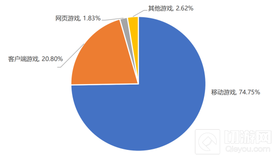 其中,移动游戏收入仍占大头,比例高达74.75%,客户端游戏以20.80%占比次之,网页游戏以1.83%占比位列第3。