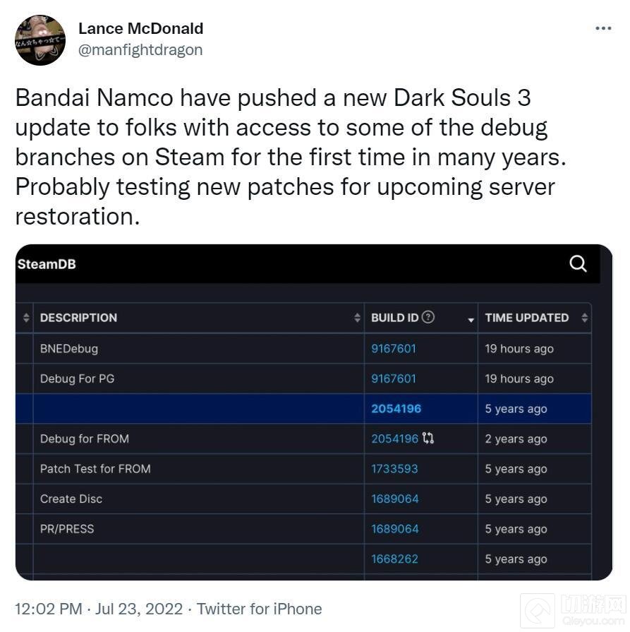 最近,技术流玩家Lance McDonald发现,《黑魂3》突然在Steam平台推送了一个后台更新补丁,这是数年来《黑魂3》唯一一次后台更新记录,他认为可能官方是在测试服务器功能恢复问题。