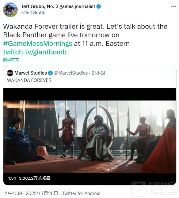 这一消息来自于经常爆料的业内记者Jeff Grubb,在他的推特上写到会在明天的直播活动中讨论《黑豹》游戏。