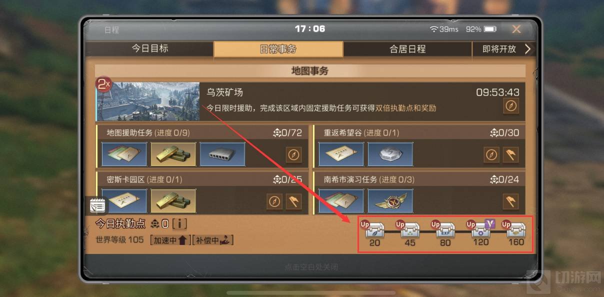 2、然后在下图标注地方可以看到日程宝箱,执勤点数够之后点击可进行领取。