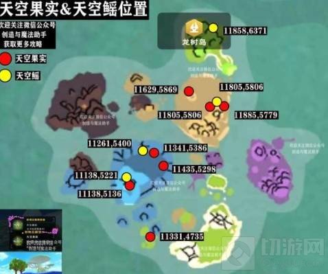2、红点就是天空果实,蓝色、土黄色、绿色小岛都有分布。