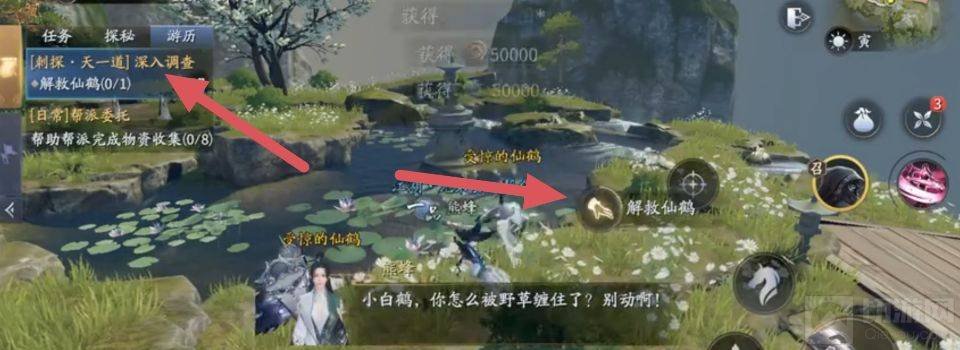 先到达天一道外面会遇到受伤的仙鹤,解救仙鹤。