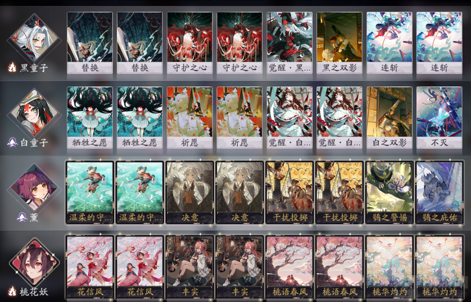 1.这是一套由白童子、黑童子、薰、桃花妖组成的大妖卡组。由于黑童子与白童子的二勾玉形态牌较为出众,所以养成大妖的卡组构筑思路也是可以进行尝试的。