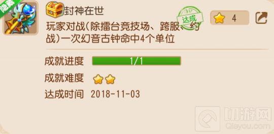 成就内容:玩家对战(除擂台竞技场、跨服、约战)一次幻音古钟命中4个单位。