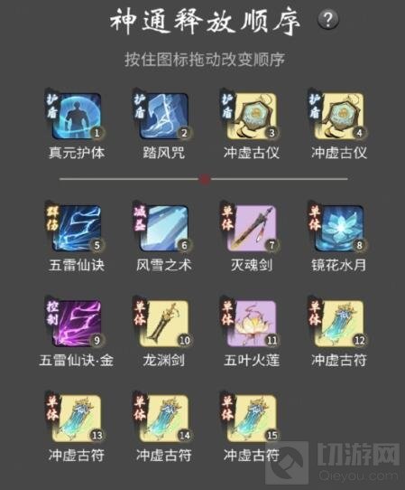 学了御龙水之后可以替换掉踏风或者真元其中一个,如果抗伤压力没那么大就选择【真元+踏风+仪】或者【真元+御龙水+仪】切记要带真元,不然一定会出现断盾的情况。*神通顺序仅作参考,实际情况还得根据各位道友的对手和自身条件来做调整