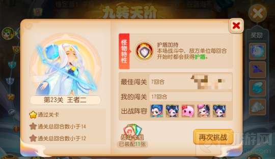 本关卡三星通关需要通关总回合小于12回合,平均每个关卡要控制在4回合以内(不包括12回合)。关卡特性每回合都会有护盾值,也就是说如果没有快速击杀,下一回合刚开始小怪身上就会又有一层护盾值吸收伤害,所以召唤灵伤害要高,少侠进场前记得携带召唤灵增益法宝。