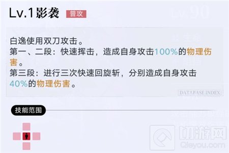 接着我们来简单说下白逸的技能,其普攻有3段攻击,1、2段攻击在1级时是100%的物理伤害,而3段攻击则是40%的物理伤害;而升级到满级10级之后,1、2段的伤害可以提升到200%,第3段的伤害可以提升80%,都是较1级为翻倍的效果,从白逸的普攻技能其实我们便能理解为何她的攻击力并不高的原因,别人的普攻都是打1段100%的物理伤害,但白逸的普攻却是打3段共计造成240%的物理伤害,且外加她拥有游戏中最为顶尖的1.5的攻速属性,白逸在输出上的能力一点也不弱于其他的S级禁闭者。另外大家注意白逸的普攻攻击范围,她是可以打到自身站位4周方向敌人的,所以对于很多禁闭者只能打右侧的敌人来讲这也是白逸普攻的优势所在。