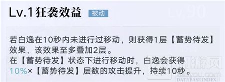 接着白逸的第1个被动技能是【狂袭效应】,其效果只要是在白逸10秒内未移动后便可以提供1层【蓄势待发】的增益buff,其可以让白逸在移动时获得10%×【蓄势待发】层数的攻击提升,持续10秒,相当于在1级的时候,白逸至多可以在移动后获得20%攻击力的提升,持续10秒,而在升到10级之后,白逸至多则可以获得的40%攻击力的提升,这个增益幅度其实还是不错的,不过考虑到白逸在战斗中的移动频率会非常频繁,所以提升的机会其实并没有想象中那么大,这点大家需要注意。