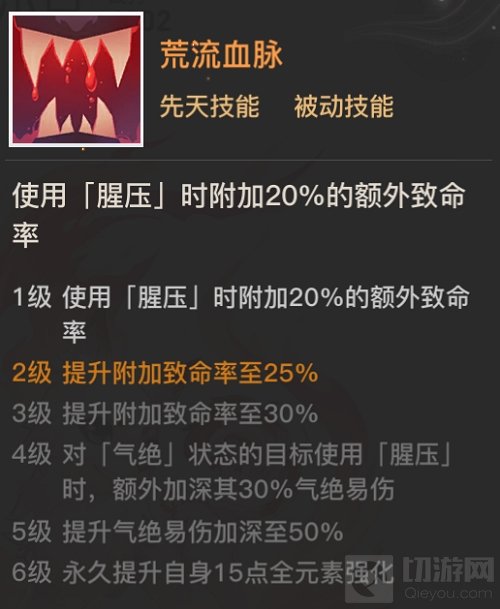4、小白的作用与土也和拔拔不同,小白最大的左右就是他的被动技能,荒流血脉:使用“腥压”的时候,附加20%的二外致命率,且升级到四级的时候,还会对气绝状态的目标额外加深其30%气绝易伤,升到五级的时候额外的气绝易伤还会提升至50%,携带小白至少要把小白的被动技能升星带5星,小白适合输出携带。