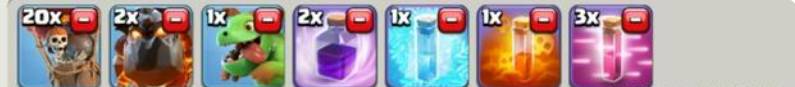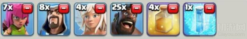 三、狗球亡灵流,20气球+15亡灵+3天狗,法术:3狂暴+3极速,核心打法:女王加毒解决援兵,先下蛮王吸引火力,然后下天狗,气球狂暴一排下,毁天灭地,再下亡灵和极速,加快清理,完美结束。