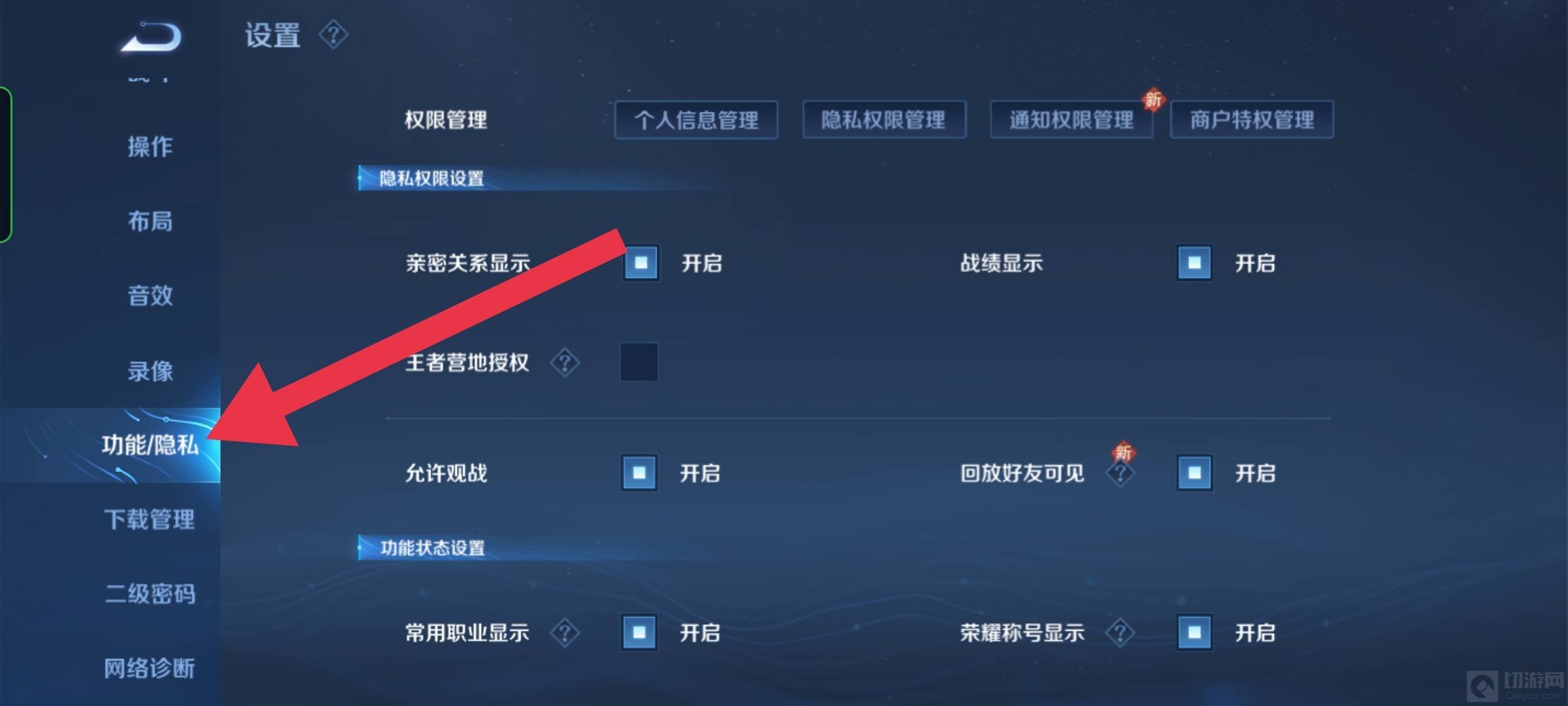 在左方往下滑,选择功能/隐私选项。