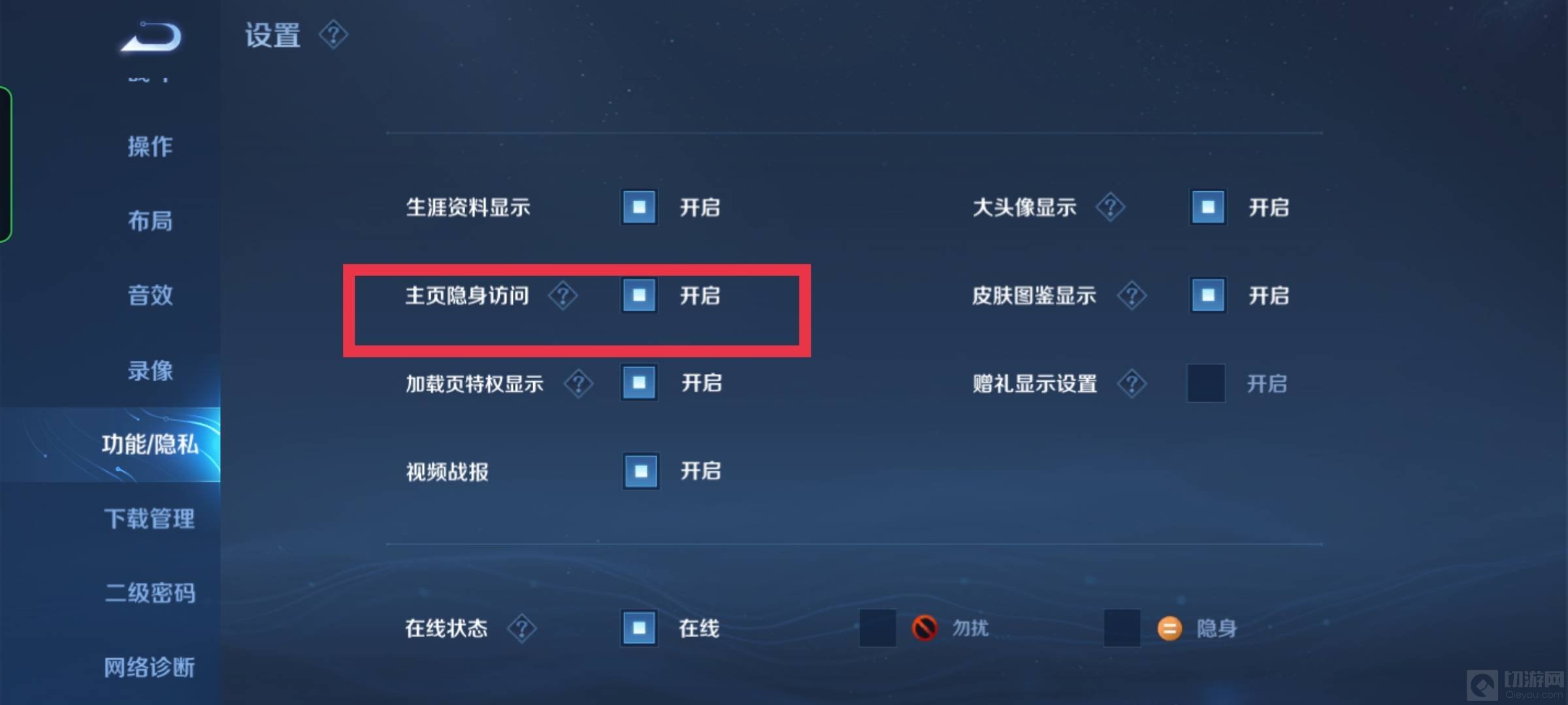 再往下滑,就会看到一个主页隐身访问选项,将他开启,就可以关闭访客记录了。
