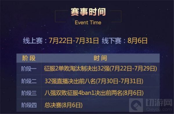 7月22日至7月29日为线上晋级赛阶段,将通过征服二单败淘汰赛赛制从1024名选手中决出32强。