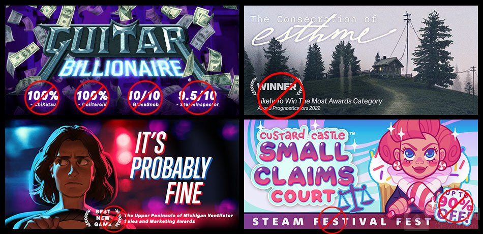 · 不可含有任何评分,不管评分是来自 Steam 评测还是外部媒体;