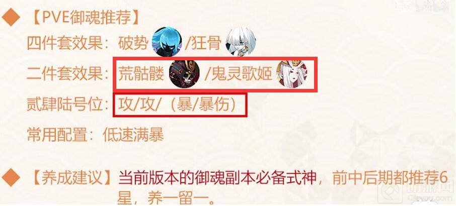 1、御魂选择荒骷髅、鬼灵歌姬,是多段伤害式神的适用搭配,饭笥自然也适合,且二技能可以提升100%攻击力,针女歌姬的伤害更可观。