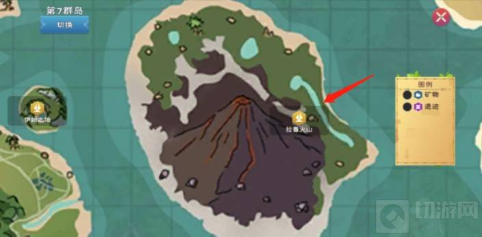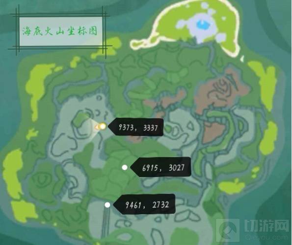 2、海底总共有三处火山,火山的位置在地图中间的小岛上,具体地点如下图所示。