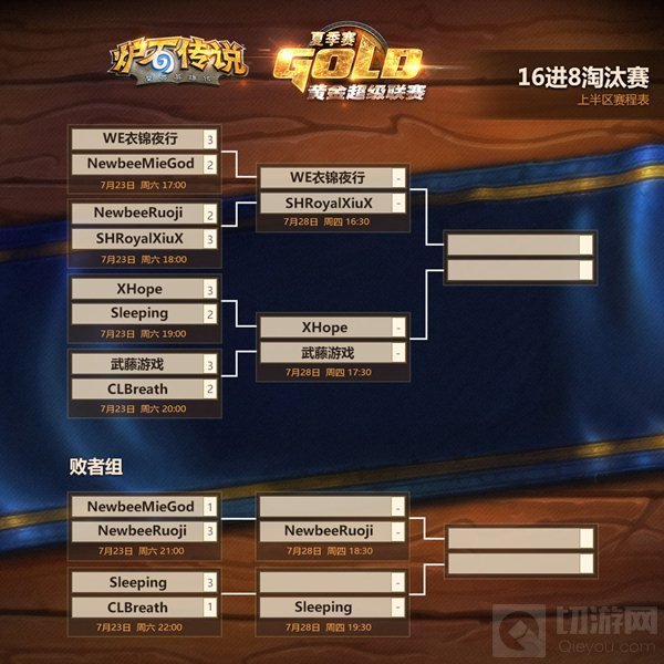 由网易和暴雪主办的《炉石传说》职业赛——2016黄金超级联赛夏季赛于7月4日-31日在上海举行。本次大赛冠军可直接获得2016中国区第二张通往暴雪嘉年华《炉石传说》世界锦标赛的门票,代表中国出征世界顶级赛事。在周六晚进行的16进8的比赛中,8名选手共进行了6场比赛,NewbeeMieGod和CLBreath不幸被淘汰,其余6名选手将在下周四晚决出4个8强席位,欢迎大家继续关注。