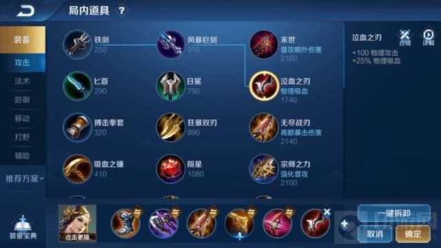 3、出装:推荐急速战靴、暗影战斧、无尽战刃、逐日之弓、破晓、泣血之刃。这套出装的核心就是暗影战斧和破晓,最好是在出完无尽战刃之后,立刻合成穿云弓,配合双穿的效果,能够让虞姬中期的输出最大化。