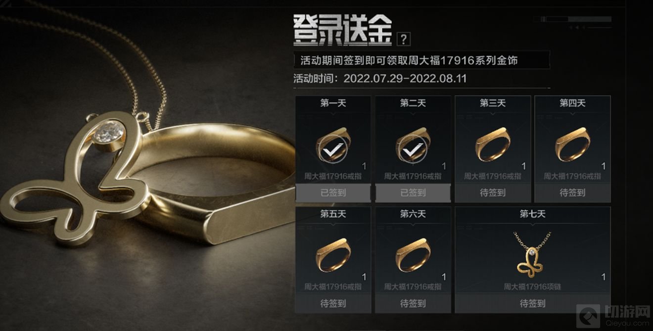 【活动规则】活动期间登录游戏,在签到活动页面签到即可领取游戏道具——周大福17916系列金戒指。累计签到七天可领取游戏道具——周大福17916金项链。