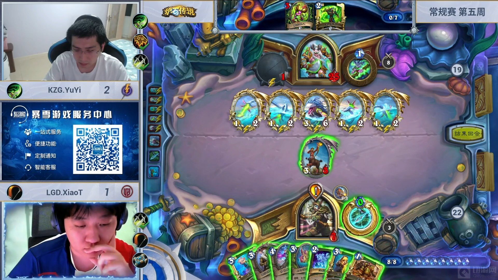 随后双方互相交换场面,7费回合,YuYi抽到渊狱魔犬希拉格并打出,XiaoT再无机会取胜,只得投降。KZG.YuYi拿下关键对局,自我掌控命运挺进季后赛!