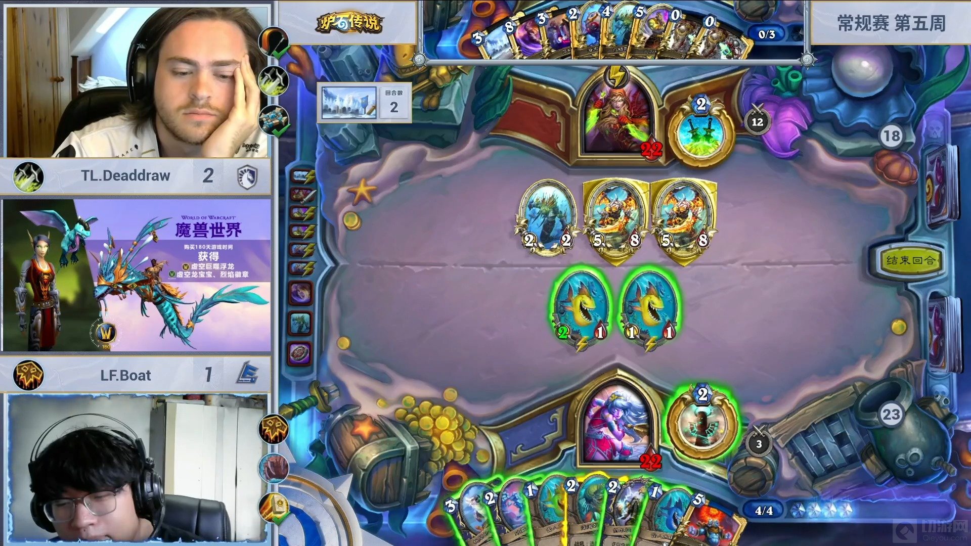 Boat使用冷风进行控场,但并不能彻底扳回劣势,Deaddraw随从进攻与直接伤害双管齐下,5费回合Boat投降。本局过后Deaddraw更加稳固了他个人积分排行榜第三的位置,锁定季后赛名额!