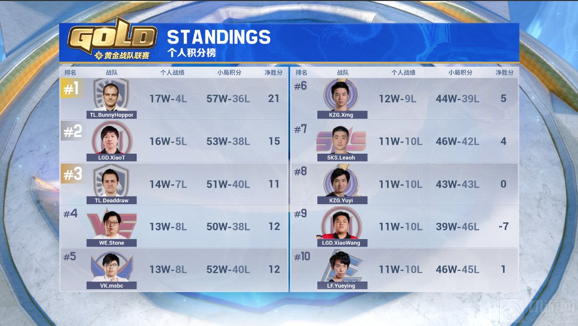 本周比赛,既有TL.Deaddraw的稳定发挥、也有KZG.YuYi的绝境逆袭。个人积分榜前八名:TL.BunnyHoppor、LGD.XiaoT、TL.Deaddraw、WE.Stone、VK.msbc、KZG.Xmg、5KS.Leaoh、KZG.YuYi最终进入季后赛,共同争夺S2赛季的冠军!