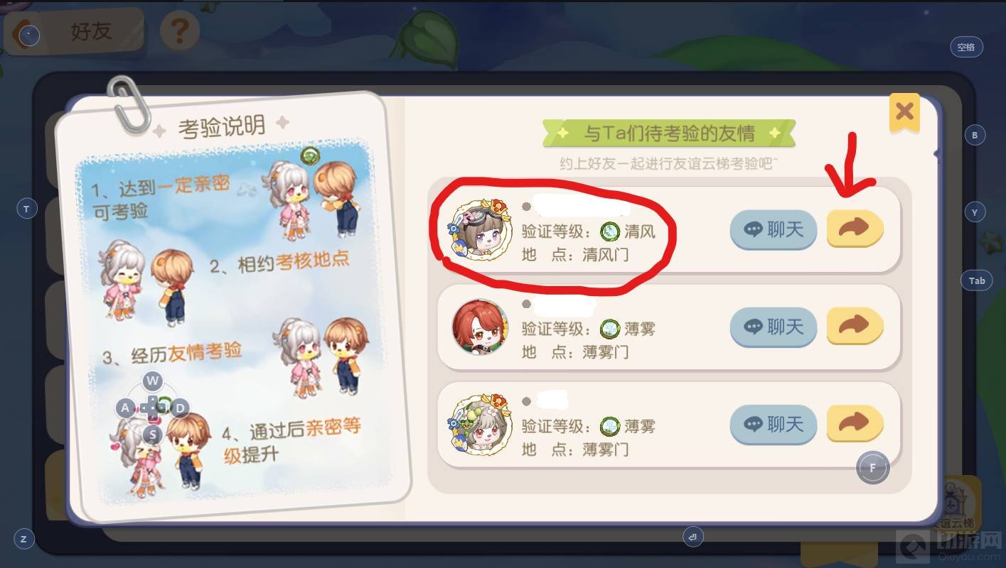 选择与你一起去清风门考验的好友,点击前往。