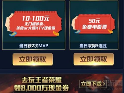 2、活动期间,王者荣耀等级达到8级的小伙伴,当日内MVP次数取得2次及以上即可领取10-100元无门槛美食、外卖或者KTV代金券;当日取得PVP模式下5连胜(如王者峡谷或排位赛,其他比赛不算),即可获得1张50元电影代金券。每日数量有限,先到先得(每天10点更新库存)。战绩纪录可能有五分钟左右延迟,请召唤师们完成游戏任务后等待一段时间后再进行领奖操作。