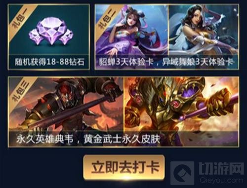 3、活动期间,前往点评参与每日福利打卡,即可获取王者荣耀大礼包(3选1),数量有限,先到先得。参与打卡的点评账户所绑定的手机号需要与领取王者大礼包的手机号一致(可直接使用手机号登录大众点评,然后去打卡即可)。
