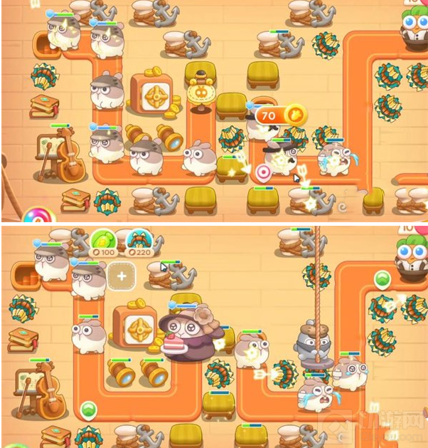 1、上一局的炮塔带到这一关后,在其放置的位置建造多重箭,将火力进行集中,锁定附近的道具进行清除,多出的金币在地图大提琴旁边放置多重箭,随即锁定大提琴,利用多重箭的特性,望远镜会被打掉,在这个位置建造多重箭。